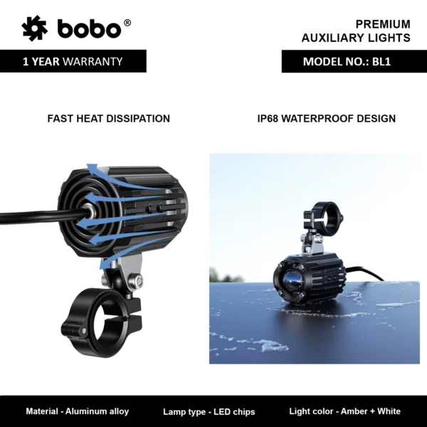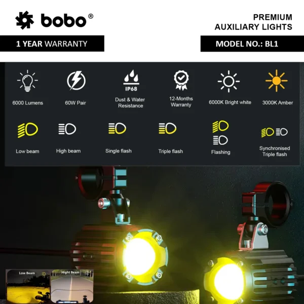 • The Bobo BL1 Premium Auxiliary Lights deliver 6000 lumens of ultra-bright LED illumination with dual-color modes, an advanced strobe wiring harness, and an IP68 waterproof design, ensuring maximum visibility and durability for all riding conditions.