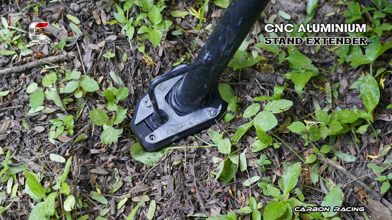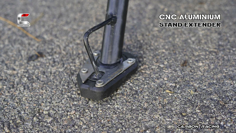 Never worry anymore to park your Motorcycle on uneven or slushy terrain. Carbon Racing presenting the Kickstand Shoes, which will extend the footprint area of the Original stand by over 100%, without compromising the ground clearance, and without interfering with any other parts of the bike.