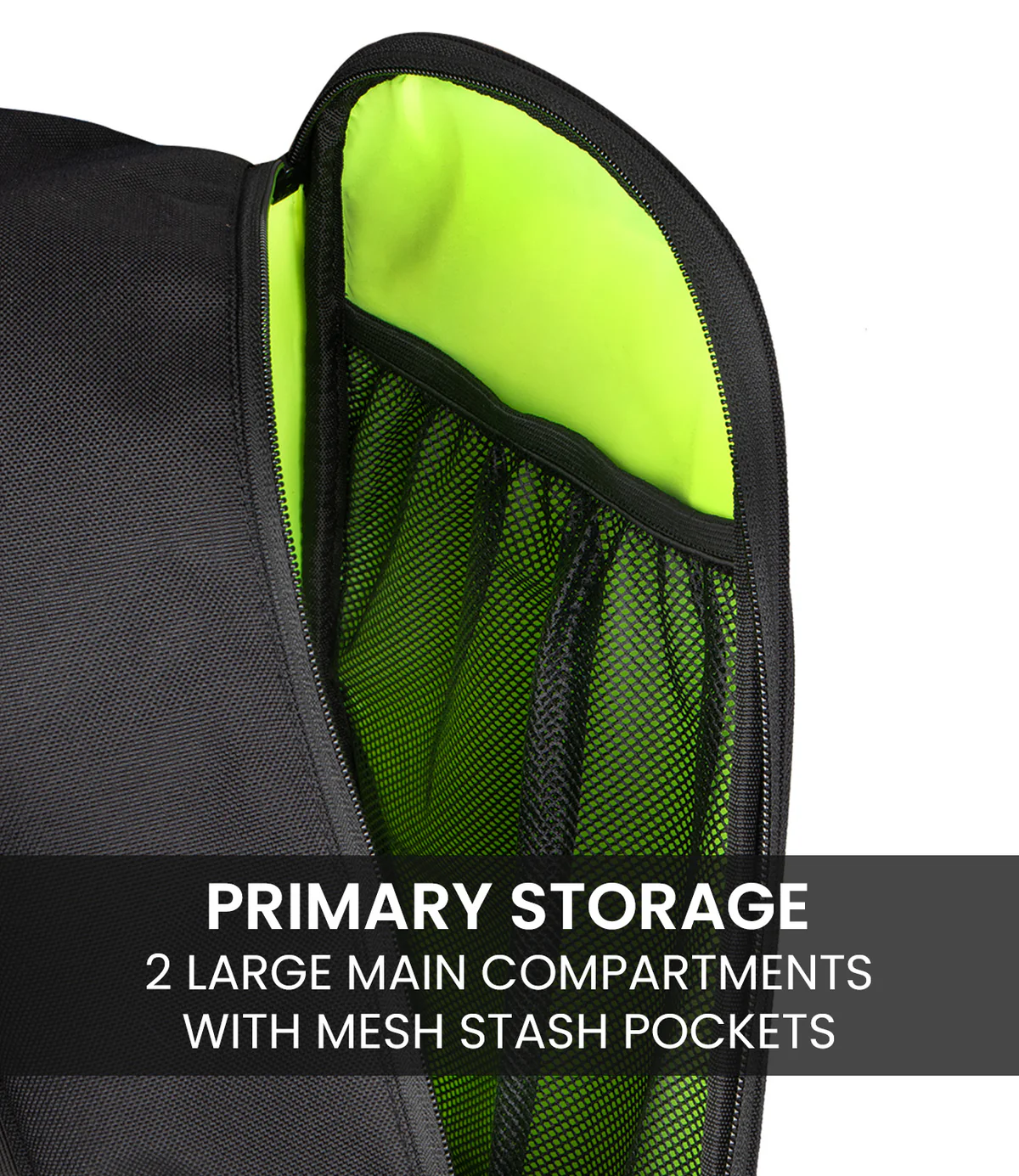 - Primary Storage: 2 large main compartments with mesh stash pockets