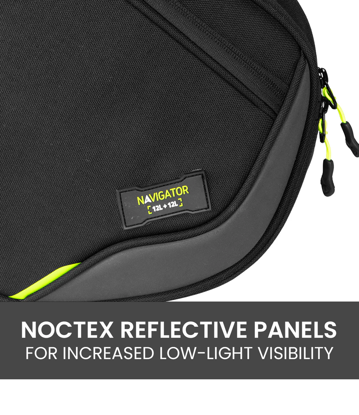 - Increased Visibility: NOCTEX retro-reflective panels light-up when light from oncoming vehicles hits them after dark. This makes the bag, and you, highly visible from the front, left or right.