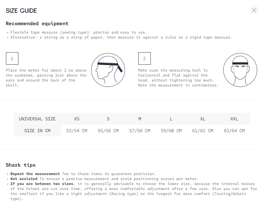 - All the Shark Helmets products are constantly subject to a continual improvement process, that’s why SHARK Helmets reserves the right to make changes, without prior notice, to the products object of this technical sheet.