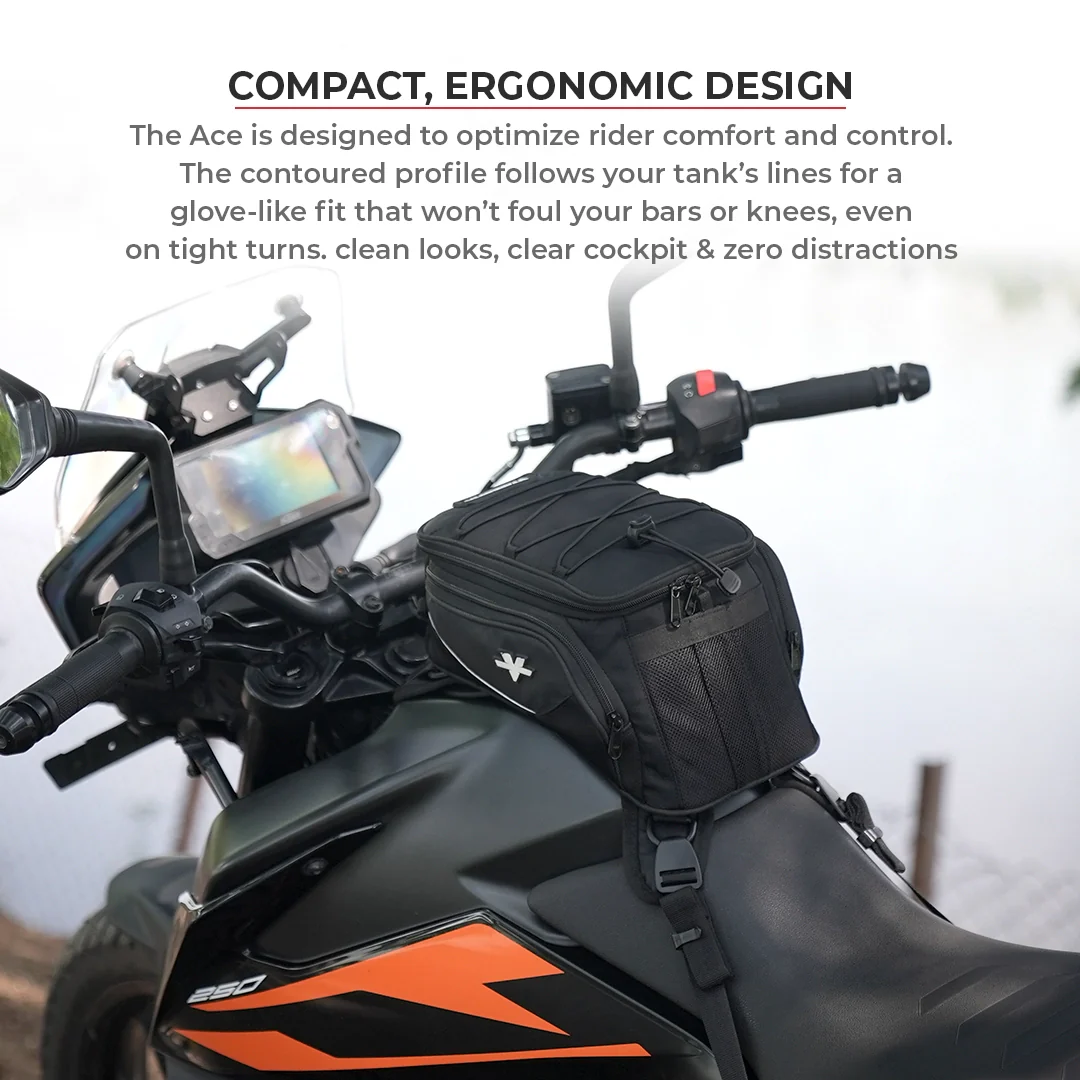 Whether you’re weaving through city traffic or cruising on weekend getaways, the Ace Universal Tank Bag blends utility with purpose-built design. Made for motorcyclists who like things simple, sleek, and modular, it fits snug on most tanks, keeps your essentials sorted, and detaches in seconds when it’s time to refuel. A commuter’s companion. A tourer’s toolkit. A bag that doesn’t ask for attention—but earns it anyway.