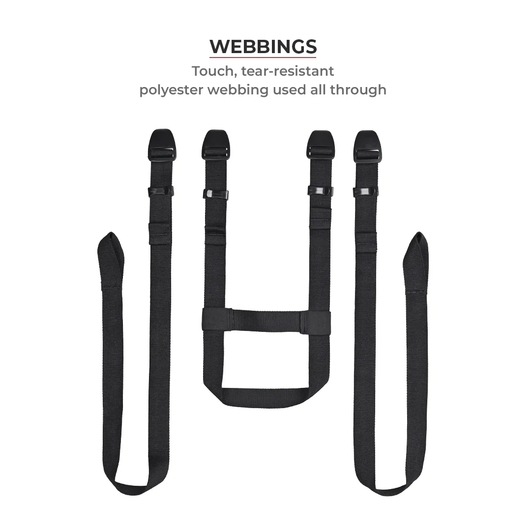 4 Point R Hook strap based anchoring system with distributed mount positions for better stress handling and zero displacement.