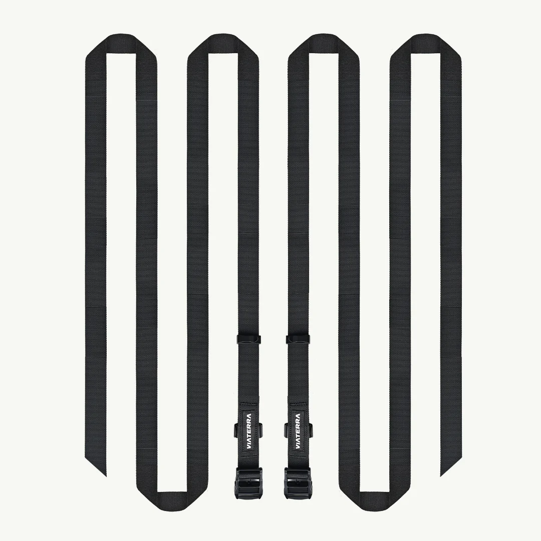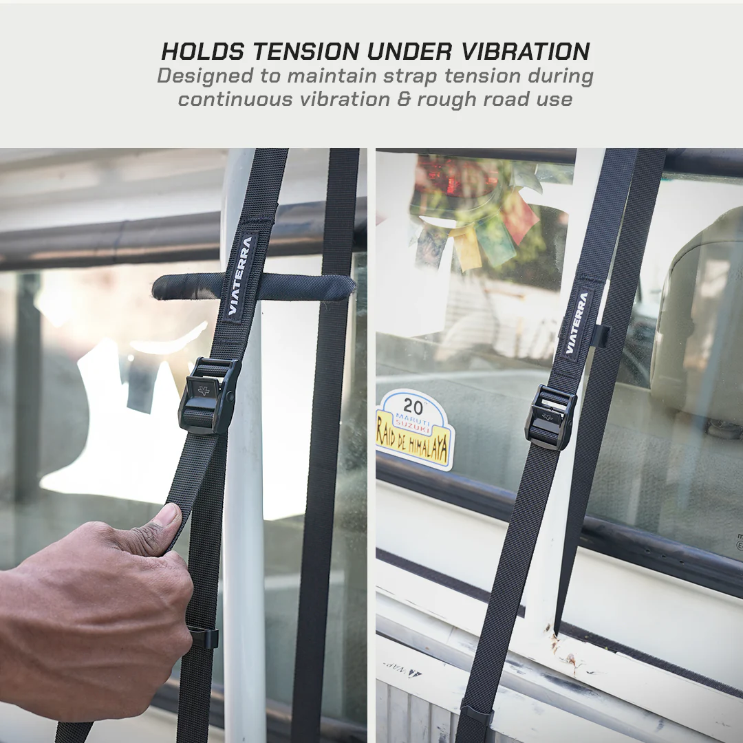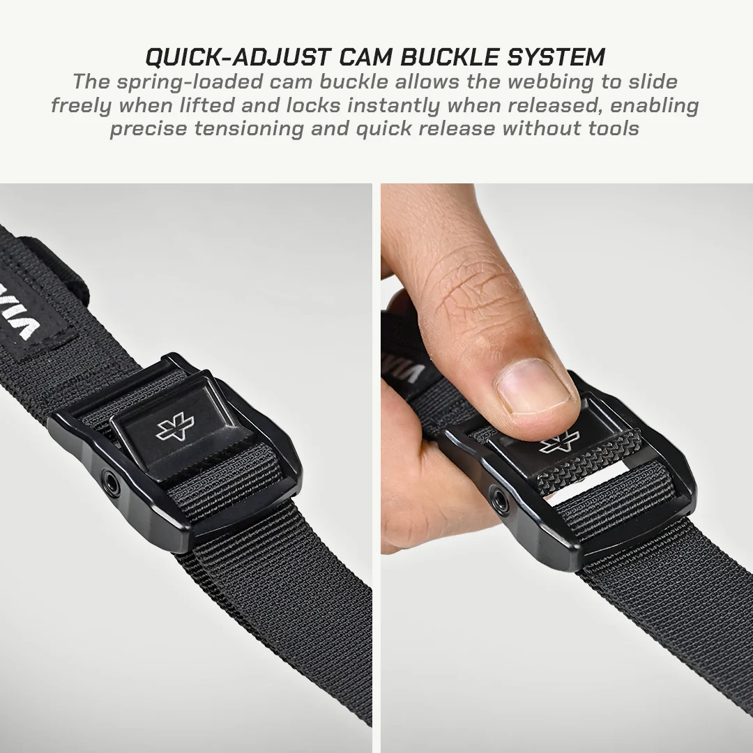 The ViaTerra Cam Straps are designed for secure luggage mounting and general utility use. Built for quick adjustment and repeat use, these straps provide a reliable, non-slip hold for motorcycle luggage, duffels, drybags, and loose cargo—without the bulk or complexity of ratchet systems. Durable High Tenacity Polyester webbing paired with alloy cam buckles makes them suitable for everyday riding, touring, and utility applications.