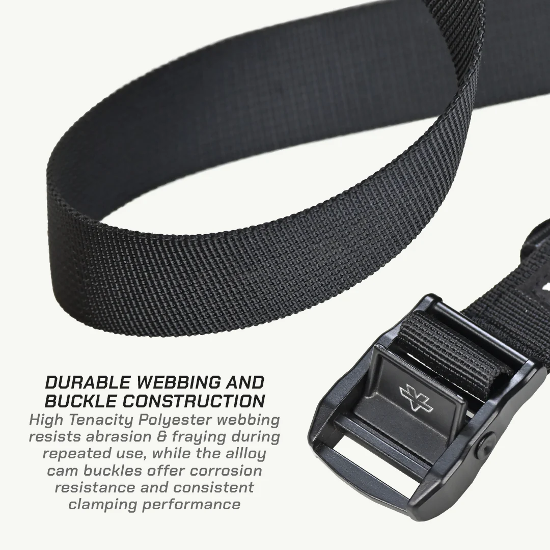 Polyester webbing provides flexibility and abrasion resistance, while anodized alloy cambuckles offer corrosion resistance and consistent clamping performance.