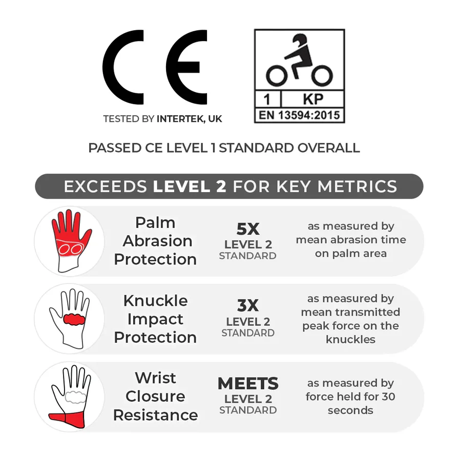 The Grid Mk3 surpasses Level 2 standards for knuckle, palm, and wrist protection, ensuring unmatched safety during road touring or track racing.