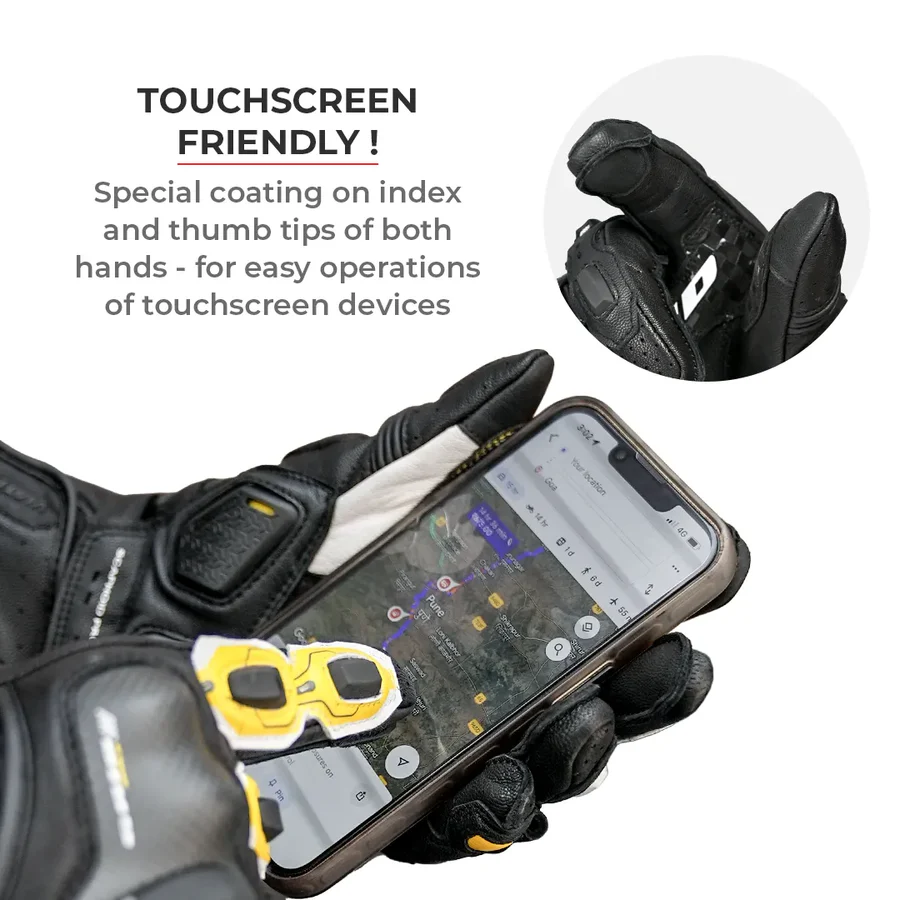 The Grid Mk3 features special conductive leather panels on the index finger and thumb tips of both hands, allowing you to use your smartphone during quick breaks or stops without removing the gloves. This conductive leather mimics a conductive path, facilitating seamless operation of touch-sensitive electronic devices. These panels are placed on the fingertips as well – allowing you to pinch and zoom easily.