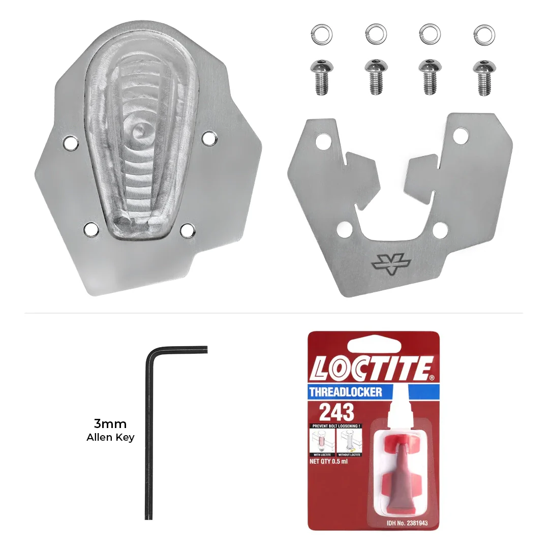 All components required for installation are provided – High strength stainless steel bolts with SS washers, 3mm Allen key and Loctite 243 threadlocker (0.5ml pack) included
