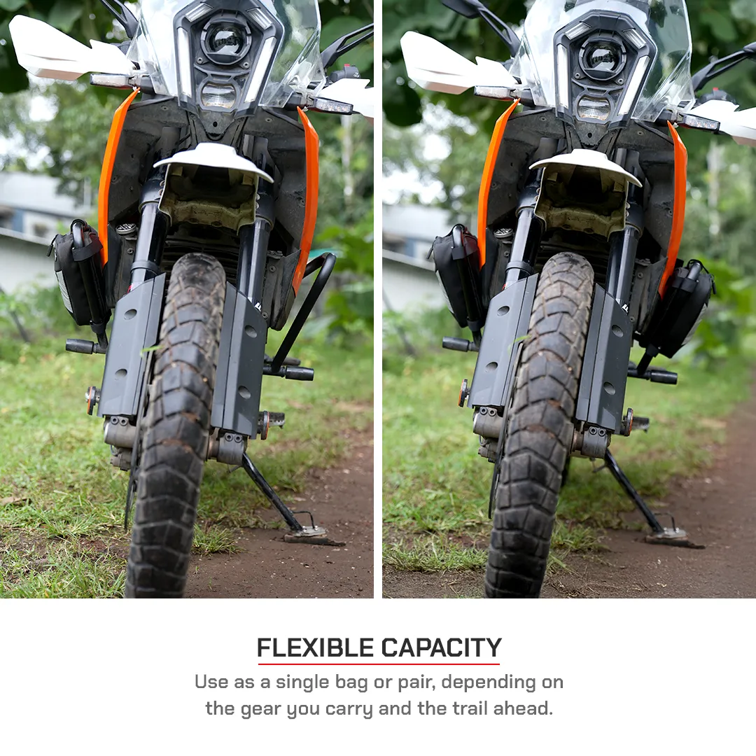 The ViaTerra TrailPack set is purpose-built for 2025 KTM Adventure 250/390 motorcycles, designed to fit seamlessly within the OEM crash guards. With a combined 4L capacity, these trailpacks are ideal for carrying the essentials—tools, spares, tubes, energy bars—while keeping your bike’s lines clean and your gear easily accessible. Built for rugged trails, these packs combine functionality, durability, and thoughtful design to match the demands of serious adventure riding.