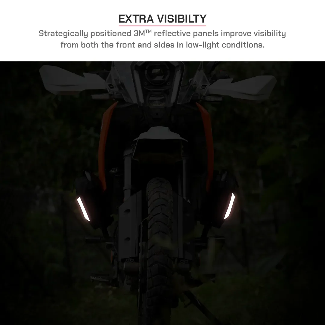 Strategically positioned 3M reflective panels improve visibility from both the front and sides in low-light conditions.