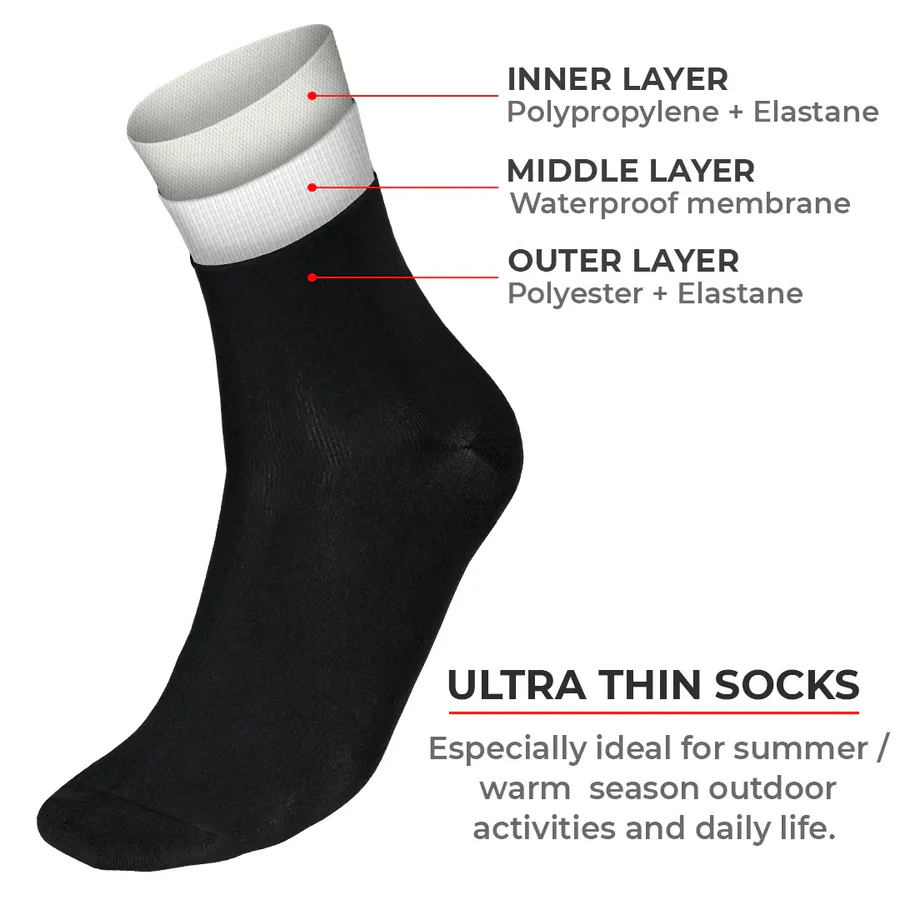 Weighing only 60gm, they are the thinnest waterproof socks in their segment. These ultra-lightweight socks weigh only half as much as regular waterproof socks, making them perfect for summer outdoor activities involving water. These socks will keep your feet dry without adding extra weight to your footwear, allowing you to fully enjoy your outdoor adventures
